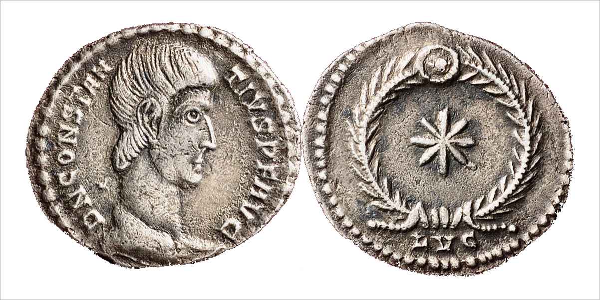 A/ D N CONSTAN-TIVS P F AVG Dominus Noster Constantius Pius Felix Augustus, Notre Seigneur Constance Pieux et heureux Auguste