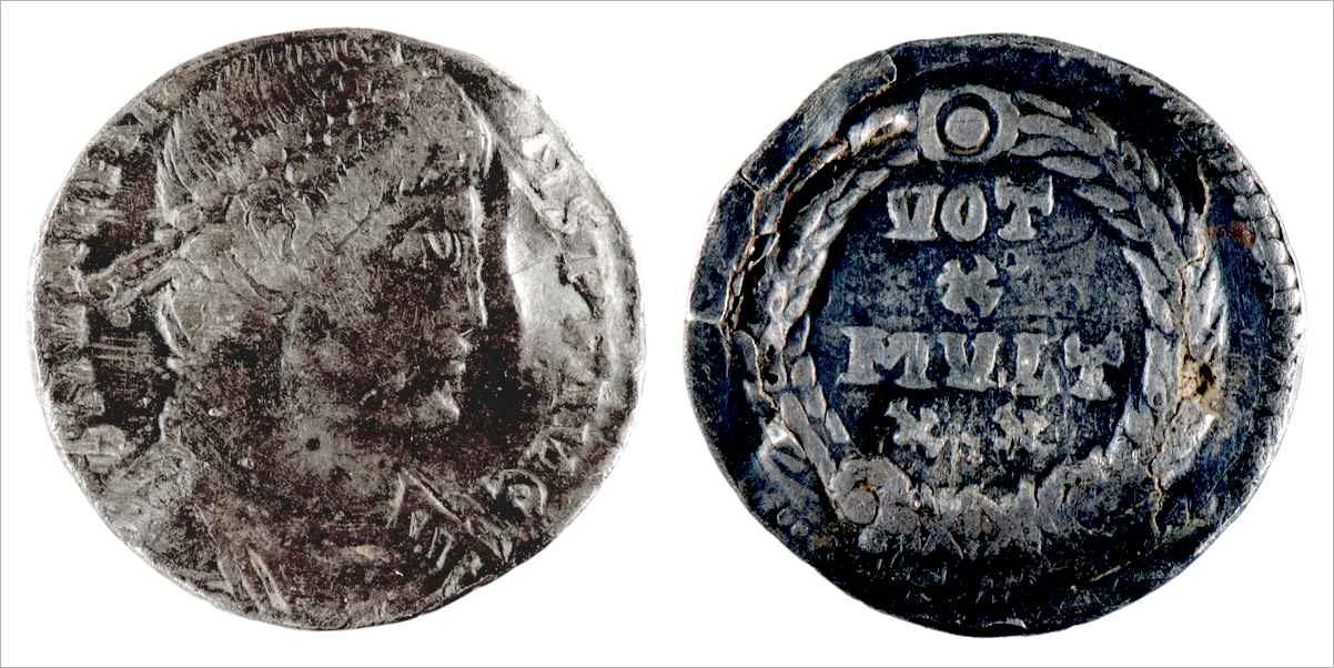 Le revers, lui, parait correcte. Mais on y voit des traces sans équivoque possible de métal moins noble recouvert d'argent. Cette silique est incontestablement fourée. Son poids, très faible pour ces émissions, autour de 1.2 gr, devrait normalement être de 2.2 gr.