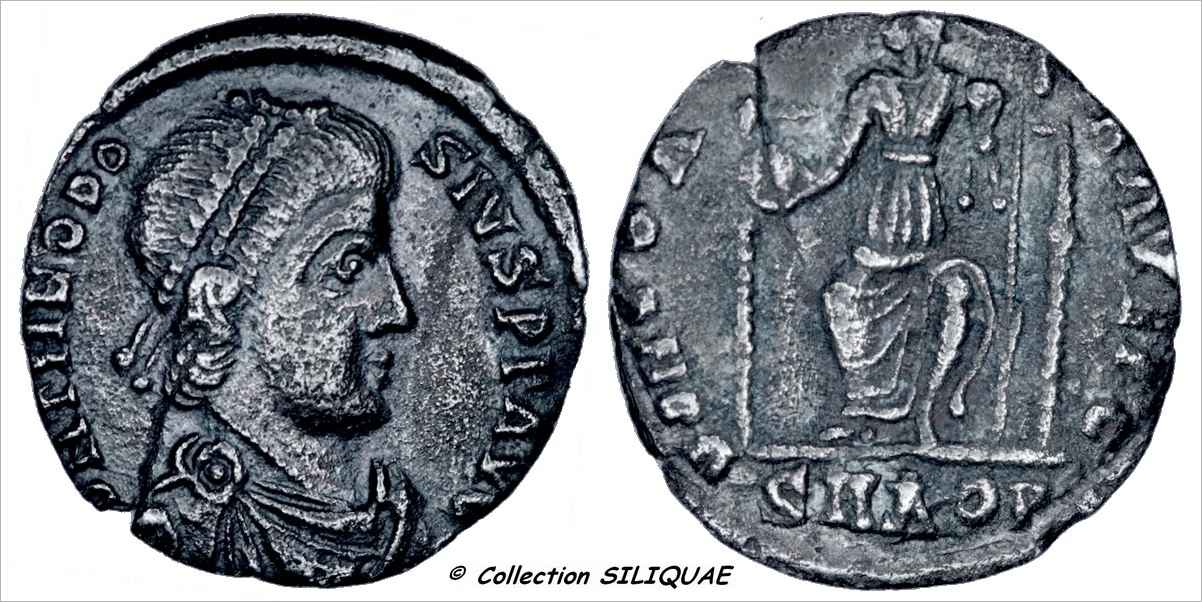 Il n'existe aucune émission de silique au nom de Théodose pour cet atelier avec cet exergue en SMAQP. Seule la RIC 25, en AQPS, a été émise entre 378 et 383 au nom de ce prince.